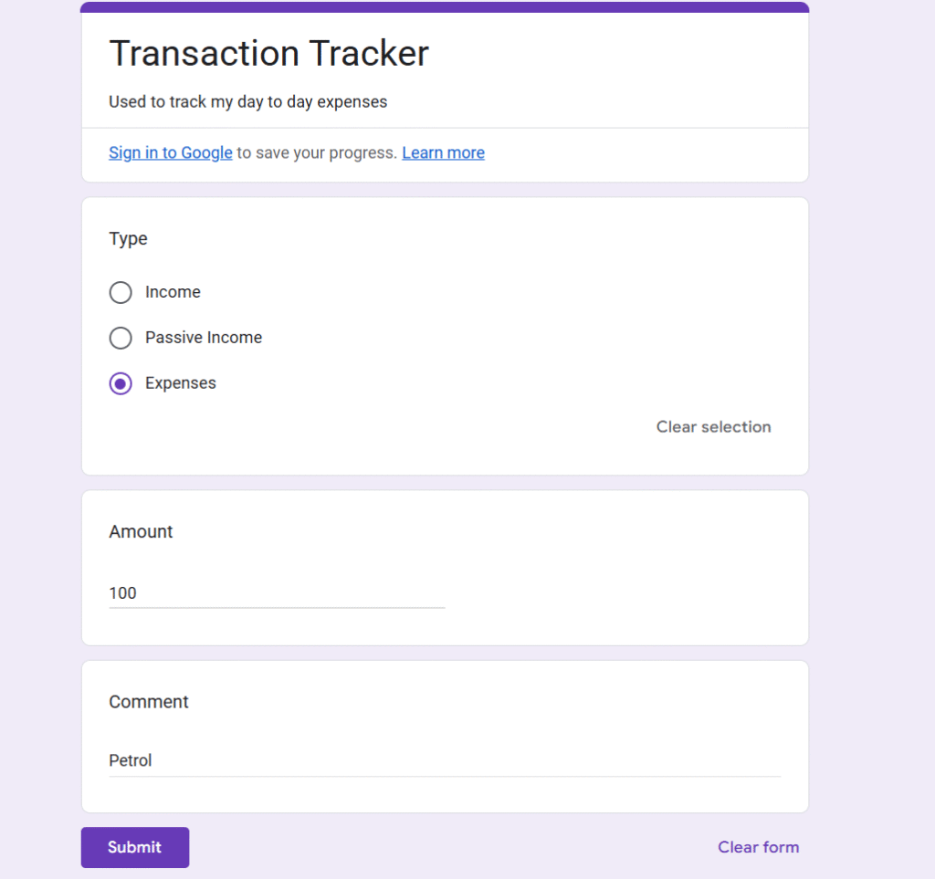 You don't need any additional mobile application to track your expenses. With help of google form you can create your own transaction tracker. There are some smart automations also we able to do with help of the google form. For example you will be able to call the REST API when ever the google form is submitted.