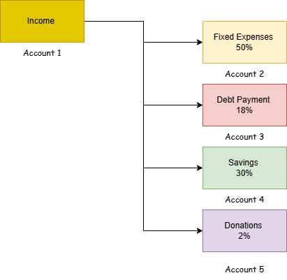 The income account needs to be used for only receiving the paycheck / salary. Basically this account shouldn't be used for any other transactions. The only transaction you are allowed to make is to your transaction account. So that you can streamline all the income to this particular bank account. Say for example if you are maintaining the budget plan something like 50% of your income should go to the fixed expenses then each month paycheck amount you can transfer 50% to the transaction account.